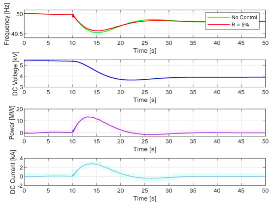 Simulation results for the SC with a DC-DC converter are shown in Figure 8. Likewise, compared to the base case, the SC with its frequency controller also improves the frequency nadir from 49.53 Hz to 49.58 Hz and the ROCOF from −0.14 Hz/s to −0.13 Hz/s during the event, without any impact on steady state frequency. The minimum SC voltage reaches 3.64 kV, much less than the directly connected SC, because of its smaller capacitance. The responses of active power and current are similar to the directly connected SC, having their peak values at 2.8 kA and 13.3 MW.