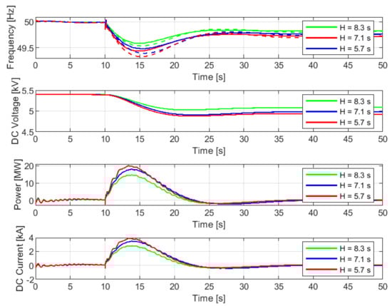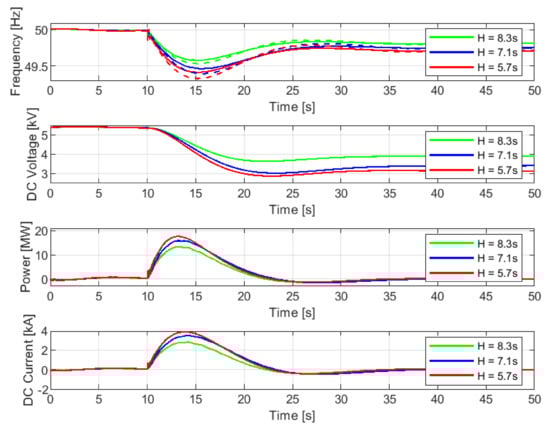 FFR provision from the converter-connected SC in systems with different inertia constants: (from top to bottom: system frequency (solid lines—cases with control, dash lines—cases without control), SC terminal DC voltage, SC output DC power, SC output DC current).