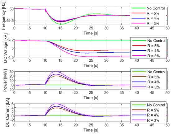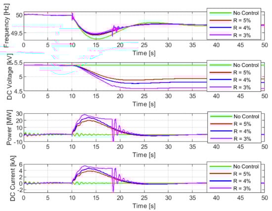 Simulation results for sensitivity analysis of droop coefficients are shown in Figure 11, while a summary of main results is also provided in Table 3, with regard to the directly-connected SC. As expected, lower droop coefficients indicate better frequency responses, where higher frequency nadir is obtained, along with lower ROCOF. It is because smaller droop coefficients represent a more aggressive frequency control action with a faster discharging of SC. As the rate of change of SC voltage increases with lower droop coefficients, SC power output increases as well, leading to higher voltage deviations at the SC terminal (voltage nadir of 4.55 kV, 4.77 kV and 4.88 kV for droop coefficients 3%, 4% and 5% respectively). Notice that with R = 3%, oscillation occurs in frequency, SC output power and output current at around t = 18 s. The oscillation results from bad PMW of the grid side converter, which is caused by low SC voltage. This phenomenon is also aligned with the previous size calculation of the capacitor. Since the capacitance C is determined based on R = 5%, a selection process for the capacitance of the directly-connected SC based on (12) and (13) is called for, due to different droop coefficients.