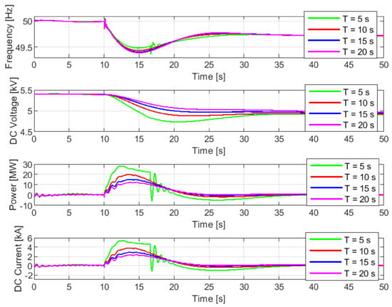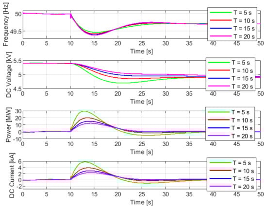 Simulation results are summarized in Figure 13 and Table 5 for the sensitivity analysis of the time constant considering the directly-connected SC. From Figure 13, it can be seen, that with higher time constants, SC voltage is regulated at a much slower pace, with higher nadir and smaller undershoot for the directly connected SC. The peak active power provided by the SC in the case of = 5 s is 28.16 MW, more than twice as high as 12.57 MW in the case of = 20 s, although the capacitance is the same. Differences among cases are also reflected in the system frequency, where the highest frequency nadir and the lowest ROCOF are with = 5 s (49.48 Hz and −0.16 Hz/s), and lowest frequency nadir and the highest ROCOF with = 20 s (49.39 Hz and −0.20 Hz/s). It could be seen that the best case is with = 5 s, as the smallest delay is introduced to frequency feedback by the low-pass filter, leading to the largest voltage deviation and the fastest control action from the SC. However, for the directly connected SC, a faster control action under the case of = 5 s comes at the expense of low DC voltage that imperils proper PWM, and causes oscillations on system frequency and SC output current at around t = 17 s.