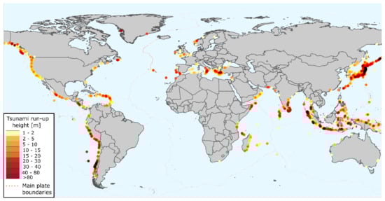 Worldwide spatial distribution of tsunami run-up heights. Darker (red) dots indicate recorded run-up heights in excess of 20 m [2].