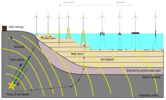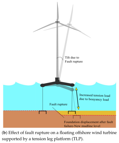 - Other major seismic hazard may arise from large fault movement. The effect of this hazard on floating offshore wind turbines is schematically shown in Figure 4a,b for catenary and tension leg platforms, respectively.
