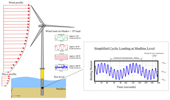 There are four main environmental loads (i) wind, (ii) wave, (iii) 1P (rotor frequency) and (iv) 2P/3P (blade passing frequency) loads whose waveform is also shown in Figure 7 for a monopile foundation. The salient characteristics of these loads are summarized as follows: