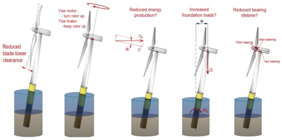 As most offshore wind turbine foundations consist of a large diameter steel pile, referred to as monopile, it is important to discuss the SLS criteria for this particular foundation type. One of the important design aspects of monopiles for offshore wind turbines is the allowable tilt permitted. The current allowable tilt is 0.5 to 0.75 degrees, and even post-seismic, this requirement must also be adhered to. It is of interest to highlight the possible reasons for stricter SLS and is shown schematically in Figure 8, and the readers are referred to Chapter 3 of the book [3] for further details. A larger tilt may reduce blade–tower collision, increased wear and tear of bearings and increased loads transmitted to the foundation.