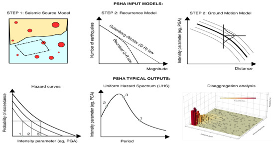 An overview of the steps involved in a typical probabilistic seismic hazard assessment (PSHA) [20,21] and corresponding outputs.