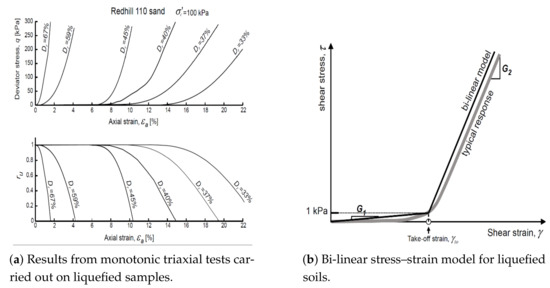 In sites with layers prone to liquefaction, the most critical event for the seismic design of a monopile foundation is the occurrence of liquefaction since it is likely to cause severe permanent tilting of the turbine. In practice, the soil–structure interactions of piles in liquefiable soils is best modeled using a set of p-y curves that resemble the behavior of the liquefied soil as observed in laboratory testing (see Figure 10a). A bilinear stress–strain model (see Figure 10b) is proposed in [25] that was used by [26] to recommend a new family of p-y curves with a characteristic strain hardening behavior, also referred to as S-shape p-y curves [26]. A step-by-step method for constructing S-shaped p-y curves is given in [4,27]. The use of an appropriate p-y curves, which are consistent with the soil response as observed in laboratory testing, is paramount since the typical p-y curves for liquefied soils tends to significantly overestimate the initial stiffness of the curve, therefore leading to un-conservative approximation of foundation tilting and the response of overall system (see Figure 11).