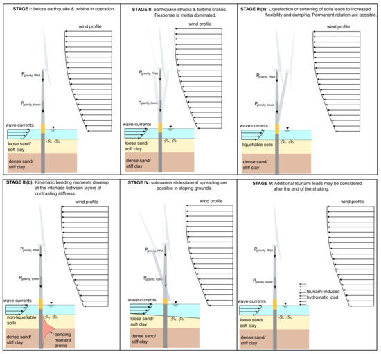 Offshore wind turbine systems can be classified into two types: grounded and floating. The readers are referred to two recent textbooks [3,4] for further details on the different types of systems and main design considerations. Figure 3 shows a schematic diagram of the main mechanisms affecting an offshore wind turbine during an earthquake.