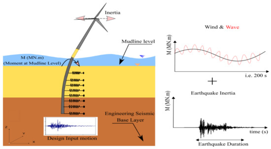 In an offshore wind turbine, the design and analysis of the foundation is challenging due to complex load conditions arising from the environmental loads (i.e., wind, wave, currents) and seismic loads in seismically active regions. Figure 7 shows a schematic diagram of the environmental loads acting on a typical offshore wind turbine, which need to be carried by the foundations and transferred to the adjacent soil.