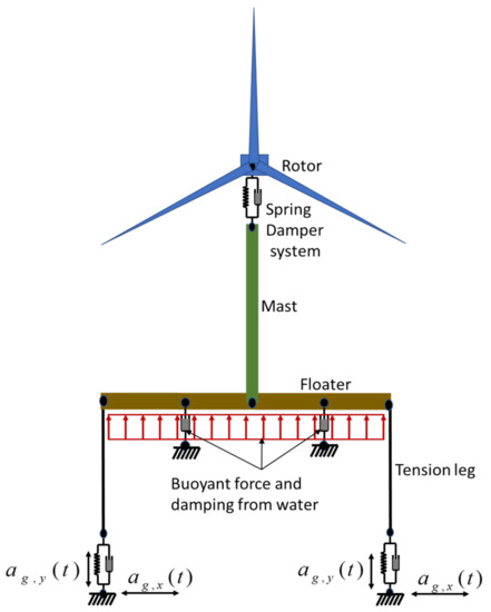 The tension legs are modeled as truss elements. The floater and mast are modeled as beam elements. The rotor mass is applied through a nodal mass element. Spring damper systems are implemented at the interface between mast and rotor and between sea bed and tension legs. The buoyant force is modeled as a uniformly distributed load acting upwards on the bottom surface of the floater. The damping generated at the interface between water and floater surface is modeled through two viscous dampers on either side of the mast. The pretension in the tension legs is achieved by introducing initial strain in the truss elements.