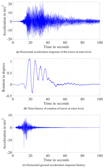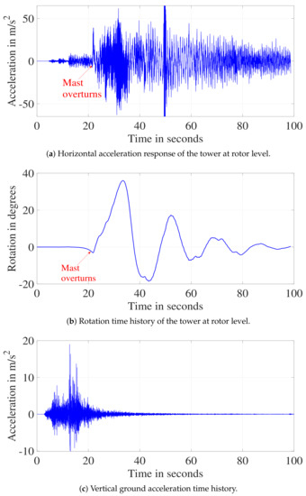 The Anchorage, Alaska Earthquake of 30 November 2018 was considered in this paper. The horizontal acceleration and rotation of the mast at rotor level for horizontal ground motion is shown in Figure 17, and in Figure 18 for vertical ground motion.