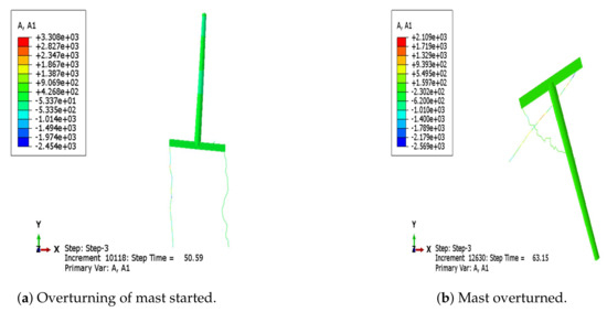 From Figure 17 and Figure 18, it is clear that the seismic response of TLP-type floating wind turbines are more sensitive to vertical ground motion than the horizontal ground motion. The overturning failure of the floating wind turbine under vertical ground motion is shown in Figure 19.
