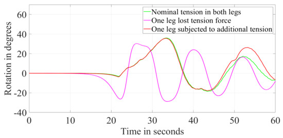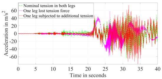A special case of fault rupture where the foundation under one of the tension legs is displaced due to fault rupture is shown in Figure 4b. Two cases can occur due to the relative displacement of the foundation under one tension leg (i) loss of the pretension force in the tension leg, and (ii) additional tension in the tension leg due to the pull of the foundation under the tension leg. A comparison of the horizontal accelerations and rotation of the mast at rotor level are shown in Figure 20 and Figure 21.