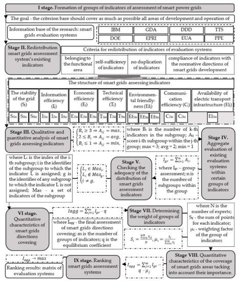 The first step of the research is to identify the existing comprehensive assessment systems. An assessment system can be called comprehensive if it takes into account several areas of smart grids. The analysis of scientific publications is a helpful tool for identifying such systems. The second stage of the study is to diagnose critical areas of smart grids. Bibliometric analysis, research of the legal framework, and reports of leading specialized organizations are sources for determining these areas. The next stage is to distribute indicators of existing systems for assessing smart grids in certain areas (groups of indicators). Redistributing indicators of existing assessment systems create an analytical basis used to determine the coverage of areas of smart grids’ development and operation. Necessary conditions for the indicators’ redistribution are the ability to attribute indicators to a specific direction of the smart grid’s development or operation, self-sufficiency of indicators, and the absence of its duplication. Subgroups of indicators were identified to be included in the analysis of more direct and indirect effects. Comparison of the existing assessment systems by the extent of covering smart grid areas will be carried out on the basis of scoring for each subgroup of indicators with the calculation of aggregate group score and final evaluation for each of the existing smart grid assessment systems.