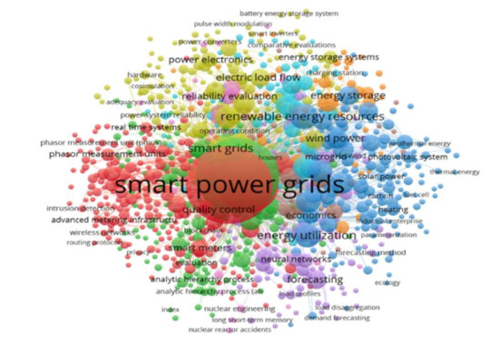 At the heart of the fourth (yellow) cluster is the concept “smart grids” (occ.—113, total link strength—1083, links—391). The following main keywords belong to this cluster: “distribution system”, “power electronic”, “energy resources”, and “micro grid”.