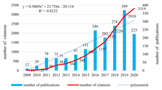 The highest citation rate—3319—was achieved in 2020. In addition, the largest number of citations per publication was in 2020 (15 citations per 1 publication).