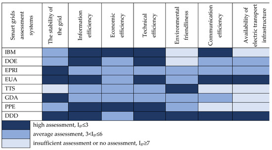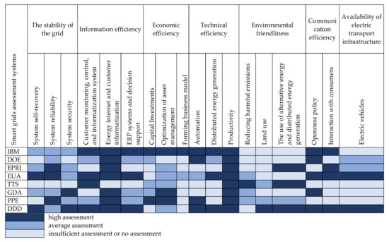 Comparing comprehensive assessment systems requires selecting the most common and representative ones. Selected comprehensive assessment systems can be attributed to complex systems (i.e., those that evaluate several smart grid areas). However, as mentioned earlier, there are many “narrow” approaches to assessing smart grids’ aspects. These aspects include the cost-effectiveness of smart grids [70,71], the efficiency and development potential of alternative energy [72], pre-investment evaluation of energy efficiency [73,74,75], or smart grids’ environmental component [76]. This study did not analyze approaches to a comprehensive assessment of smart grids which do not provide excellent detail of the assessment processes [77,78].