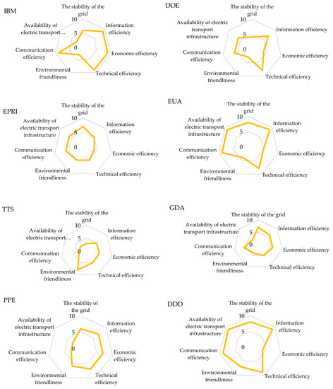Approaches to the systematic evaluation of the efficiency of smart grid development have been considered in the papers [48,49]. However, these studies did not aim at establishing which of the studied evaluation systems most fully considers all the critical areas of a smart grid’s operation. Thus, based on these studies, it is impossible to conclude which of the comprehensive assessment systems has the most systematic and comprehensive approach to evaluating smart grids.