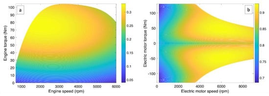 Considering the same map-based approach used for the engine, the motor efficiency is represented through the map in Figure 2b, where two main regions can be identified: (i) a low-speed region with constant drive torque and (ii) a high-speed region with constant drive power. The maximum speed and torque are 9000 rpm and 130 Nm, respectively, and the transition speed (from low-speed to high-speed regions) is about 3200 rpm.