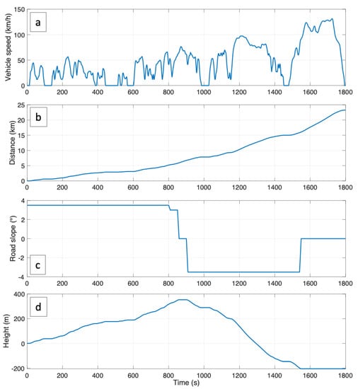 Desired speed (a), traveled distance (b), considered road slope (c) and related traveled height (d) for the accounted WLTC cycle.