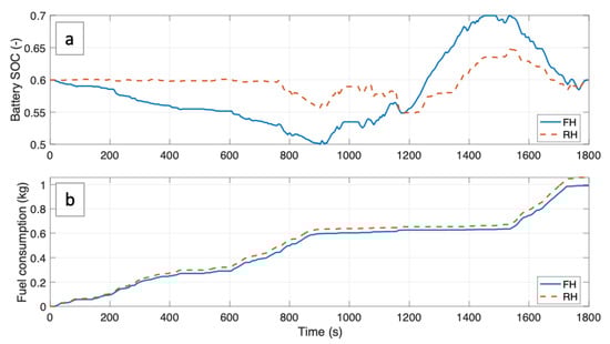 Figure 5 reports with solid blue lines the results achieved with an FH approach on the considered cycle in terms of SOC (Figure 5a) and fuel consumption (Figure 5b) behaviors over time. It can be observed that the strategy based on the knowledge of the entire path asks for an almost continuous discharge of the battery until the minimum SOC is reached at 900 s. Afterward, the battery is charged, taking advantage of both engine charging and regenerative braking, until the maximum allowed SOC is reached at around 1500 s. The last part of the highway route accounts for battery discharge to respect the imposed SOC at the end of the path (i.e., 0.6 reached at 1800 s).