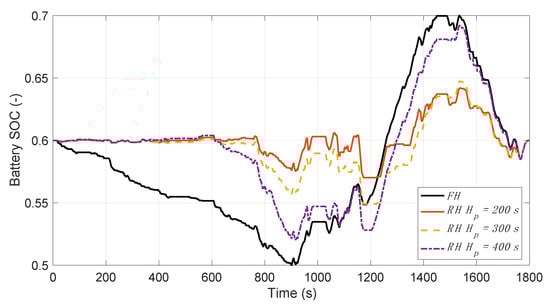 To investigate the change in EMS results with different Hp windows, the same Hs value of 150 s is considered, and two further values of 200 s and 400 s are accounted for Hp. The related results in terms of SOC trend are shown in Figure 6 with respect to the FH, and the RH results formerly discussed. It can be immediately seen that, by increasing the horizon (i.e., the path) length, the SOC trend tends towards that of the FH, as obviously expected.