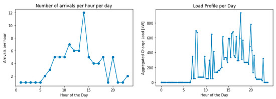 Results from the simulations carried in [19] showing arrival rates in one day (graph on the left) and estimated loads as a consequence of this type of arrival pattern (graph on the right). Here, an example of a future situation where demand is 4 times higher than today and where this demand is met with an extra superfast charger of 300 kW is presented.