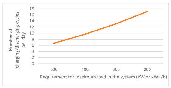 If opportunity charging is used, the number of full charging/discharging cycles with respect to the maximum load demand is presented in Figure 2. An amount of 500 kW is the absolute maximum due to the grid capacity limit at the INSPIRIA charging station. Thus, the “maximum load requirement” refers to criteria set where the EV charging demand (as associated with an increased number of both EVs and charging facilities) is covered without going above the 500 kW grid limit. With higher load requirements, the number of charging/discharging cycles decreases. Thus, the higher the load, the closer opportunity charging will come to depot charging.