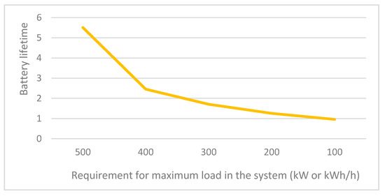 Figure 3 illustrates the relationship between the battery’s lifetime and the maximum load requirements. Again, the requirement for maximum load refers to the EV-charging-associated demand (based on both more EVs and more charging facilities), with an upper grid limit set to 500 kW. Looking jointly at Figure 2 and Figure 3, it is made clear that the lower the maximum load requirements are (and the lower the battery’s capacity), the more charging cycles will be performed at INSPIRIA, and the shorter the lifetime of the battery will be. Thus, given a battery lifetime that includes 6000 charging cycles for a battery size of 100 kWh, the battery lifetime could be depleted in one year given the frequent peaks (see Figure 1—right-hand side) that need to be covered at the charging station during the day.