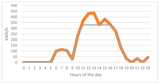 Average daily load profile at the INSPIRIA charging station (orange line) versus a daily profile where battery storage has been utilized (grey line). The storage-enhanced load reduction is represented by the difference between the orange and the grey line.