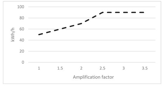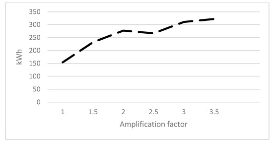 Battery size measured in kWh as a function of different demand levels presented by an amplification factor. Amplification factor 1 means the current situation, while 2 refers to a situation where demand (as associated with the arrival rate in each hour) is doubled.