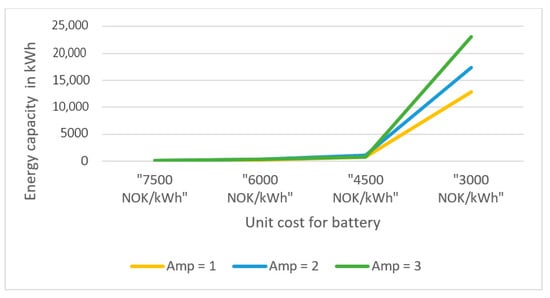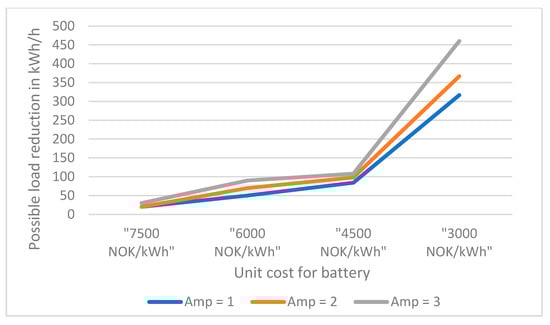 In addition, the price of the battery will be crucial to achieve a significant power-reducing gain. The results from the simulations with different amplification factors where the relationship between load reduction and battery prices is investigated is shown in Figure 7. As it can be seen from the graph, demand has a certain significance. However, it is the unit cost of the battery that gives the greatest impact. If the battery price falls below 4500 NOK/kWh, there is an exponential development. This is primarily due to the fact that the energy storage will to a greater extent be able to shave off secondary peaks, which often are far more than the largest. Further, Figure 8 illustrates the relation between the increasing demand, energy capacity, and the battery unit cost. A similar major difference for a battery unit cost below 4500 NOK/kWh can be observed. The simulation-based data used for generating Figure 7 and Figure 8 are reflected upon later in Section 4.