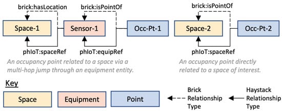 The term applicable point is used throughout this section to identify a point that conveys information about an entity of interest. We allow an occupancy point to be applicable for a particular space in two ways: (1) an occupancy point is directly associated to the space of interest, or (2) an occupancy point is associated with a physical sensor or equipment that is associated to the space of interest. A visual representation of these two configurations is presented in Figure 1.