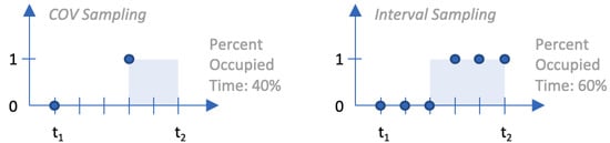 We begin by defining conventions regarding occupancy sampling techniques as they are relevant to the calculation of the percent occupied time. Two prominent sampling methods are fixed interval sampling and change of value (COV) sampling. Simply put, fixed interval sampling consists of data being logged at a specified time interval (), whereas COV sampling only logs data when a sensor value has changed outside of a specified value. With occupancy sensors, COV sampling practically means that a value will be logged every time the space goes from unoccupied to occupied (This can be represented many ways, such as 0 or 1, “on/off”, “occupied/unoccupied”, etc.). This is important for the following reasons: