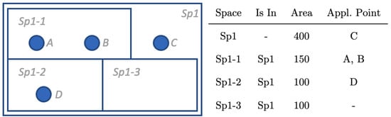 With these considerations, we define the following conventions: represents the set of spaces contained within space j that have at least one applicable occupancy point and represents the set of spaces contained within space j that have no applicable occupancy points. For example, in Figure 3, with , and .