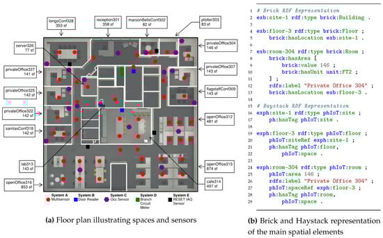 Figure 4b demonstrates the modeling of the primary spatial elements (building, floor, and room) using both the Brick and Haystack schemas. For simplicity, the Brick representation does not include inferred metadata (Inference demonstrations can be found [46] with details described in [28]). Per the Haystack RDF export specification [47], all tags are exported as objects of the ph:hasTag predicate. Notice that the only metadata required to be added to the Brick and Haystack entities, besides specifically declaring their type, is the metadata used to convey their floor area, which is already reported when submitting ventilation requirements on mechanical drawings and therefore should be easily accessible from design documents. An example of adding area properties for Brick and Haystack spatial entities is shown in Figure 4b.