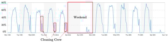 The information displayed in Figure 5 demonstrates that the space utilization calculation can capture fluctuations in occupancy patterns, a known limitation in existing occupancy modeling for buildings [49]. Besides being used as part of KPI calculations, space utilization could also be used by BEM professionals to assist in energy model calibration. Specifically, the fluctuations in occupancy throughout the course of a day can be seen. While ground truth measurements are not available, some simple heuristics about the occupancy patterns of the occupants are known. The schedule for the majority of workers in the office space was known to be 8 am–5 pm, with some workers starting slightly earlier and others staying later. It was typical for people to eat lunch in the office, so the noticeable lack of lunch time dip in occupancy status also aligns with expectations. It was rare for people to come into the office on the weekends (captured), and a cleaning crew came every weeknight after hours (also captured). Therefore, the shape of the space utilization calculation aligns with expectations.