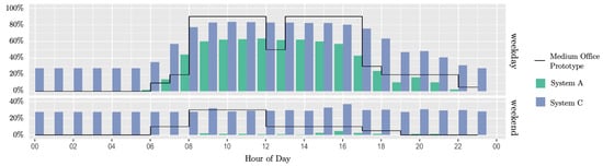 Average daily profiles of the for System A and System C. The DOE Medium Office Prototype building schedule is overlaid for context.