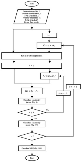 where is the total network operating cost. According to Equation (10), the basic principle of the NUC allocation of Kirschen’s tracing method is based on the proportion of the flow supplied by each generator in each branch power flow. Hence, a DER with a high generation capacity will charge a high NUC even though its generation is consumed by the local area and, thus, does not contribute to congestion. Therefore, in this section, Kirschen’s tracing method for NUC allocation is modified by using a sensitivity index to distribute the NUC according to the generators’ contribution to congestion.
