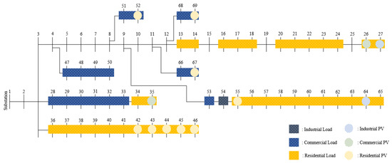 A distribution system containing multiple DERs was simulated based on the small-scale DER aggregator market operation in South Korea. For this, the original IEEE test system was modified to incorporate multiple loads and DERs depending on whether the customer type is industrial, commercial, or residential, as shown in Figure 3.