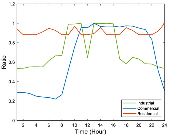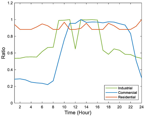 The original test system did not provide a time-varying load; therefore, simulations were performed using the hourly consumption data obtained from [25]. For diversity, different types of loads are applied, including industrial, commercial, and residential customers. Figure 4 shows their normalized patterns of load profiles during the day. It can be seen that the residential customers have no significant loading variation throughout the day. However, the electricity consumption of commercial and industrial customers depends on their business hours.