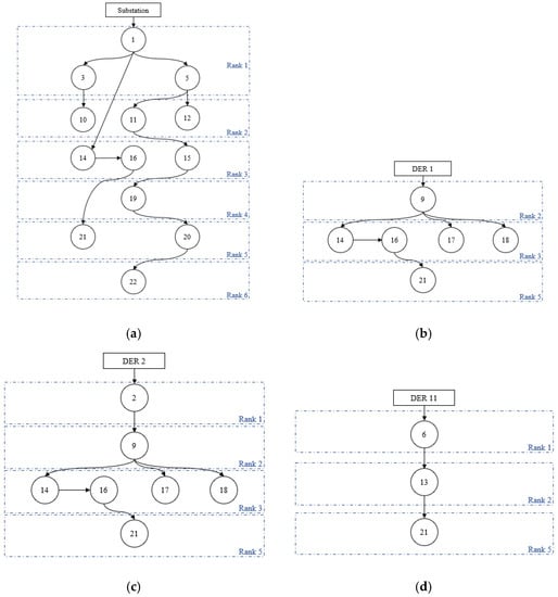 After all connected commons are identified, they are configured based on their ranks and connected to each other according to the power flow directions represented as links. Finally, the equivalent networks of the substation and DER 1 are illustrated in Figure 7a,b. The equivalent networks of DER 2 and DER 11 are also presented in Figure 7c,d, respectively.