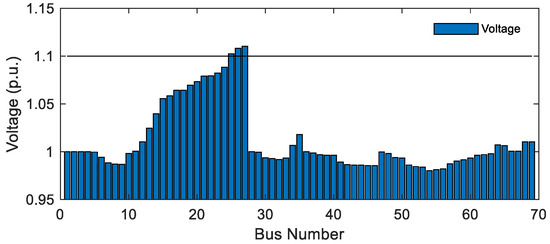 In this section, the NUC allocation to the DERs using the proposed method is compared with that using the fixed NUC and postage stamp methods and Bialek’s method. The simulation was performed at the PV peak time (1 p.m.). Large PV generation can cause congestion problems represented by voltage violations unless a proper dispatch is applied. The voltage violation is represented when the voltage magnitude exceeds ±10% of the nominal value [29]. Figure 8 shows the location of a voltage violation occurring because of a large PV generation injected into the system at peak time as a reference case. However, this congestion problem cannot be released by the fixed NUC charge because it only considers the amount of generation. Therefore, the NUC needs to be charged differently depending on the significance of causing a congestion problem.