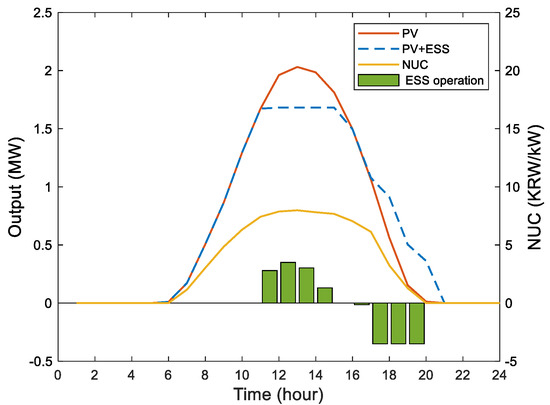 The ESS operation with DER 2 is shown in Figure 9. The ESS is charged during a high-NUC period from 11 a.m. to 3 p.m. by maintaining less than and discharged when the NUC is cheaper from 4 p.m. to 8 p.m. Although it can be discharged at 3 p.m., it begins discharging from 4 p.m. because of the relatively low NUC.
