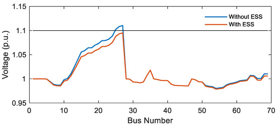 To verify the effect of ESS operation owing to the high NUC during the peak time, the voltage profiles at the buses are compared again with and without ESS operation, as shown in Figure 10. In the figure, the ESS operation is able to clear the voltage violations by maintaining the voltage profiles below the limit. It can be concluded that the proposed method is able to allocate the different NUCs at different buses depending on the significance of causing a congestion problem and, thus, encourage the DERs to reduce their generation by charging the ESS to solve the congestion.