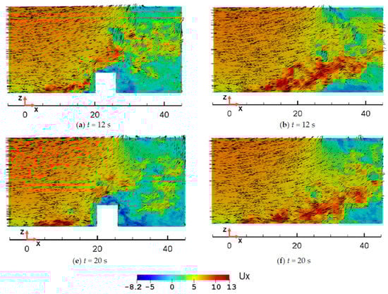 In subfigures (a) and (e) the white box instances the presence of a 6 m cubic building. Subfigures (b) and (f) show the fire passing by the building 9 m distance from its center. I.e., 6 m from the side [] (p. 9). Colorbar represents velocity in m/s along x axis.