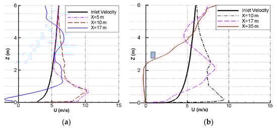 Subfigures (a,b) show the vertical profile of the airflow’s changing longitudinal velocity at different longitudinal positions relative to the inlet location. Subfigure (a) shows airflow aligned with the building’s center line. Subfigure (b) shows airflow passing 9 m on either side of center line [] (p. 10).