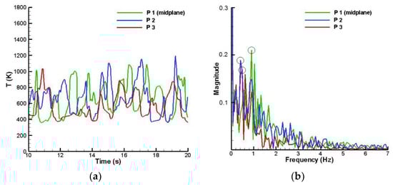 Subfigure (a) shows the instantaneous surface temperature as measured in Degrees Kelvin at 3 points located on the surface 5 m from the building front. P1 is directly on the building’s center line, whilst P2 and P3 are located 9 m on either side of the center. Subfigure (b) shows the frequency of peak temperature signals at these same sensors [] (p. 12).