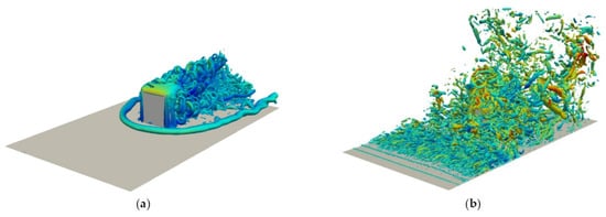 Figure 4 describes high velocity winds over and around a structure with (b) and without fire (a). Figure 4b demonstrates that in the presence of fire, myriads of small vortices initially hug the ground, then buoyancy inducing forces dominate, creating larger vortices that randomly cross hatch the structural zone generating significant uplift: The structure is attacked simultaneously by embers, heat flux, and wind loads from multiple directions, introducing dynamic loading at numerous points and angles.