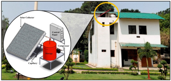 The solar water heater’s performance can be enhanced either by reducing the top heat loss or by improving the convective heat transfer coefficients by changing the working fluid and extracting that heat via a heat exchanger. In this study, the primary concern was the enhancement of the thermal performance of the SAHPSWH. The effects of different parameters, such as the configuration of the collector tubes, glazing material, ambient conditions, and solar intensity on the flat plate collector efficiency, were assessed to expand its commercial applications. An experimental setup was constructed as shown in Figure 1, in which necessary parameters and component specifications, such as the absorber plate thickness, the distance between the collector tubes, and tube diameter, were first optimized using mathematical models, along with climatic variations measured by various measurement devices. The experiment was performed in a composite climate in India in a low-cost bamboo house to completely replicate the winter climatic conditions in the country, which was then supported by theoretical analysis. The readings during the experiment were taken at five-minute intervals.