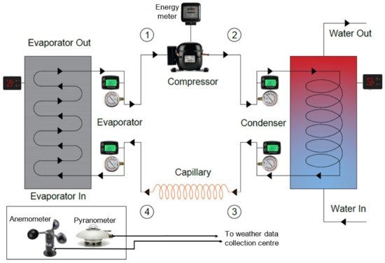 Condenser: The condenser was used here to transfer heat to the water. The main function of a condenser is to condense a refrigerant from its gaseous state to a liquid state, after which its latent heat is moved to the storage tank. The condenser consisted of copper tubes with an outer diameter (9.525 mm) and length of 9.75 m immersed in the storage tank, which was assumed to be non-stratified, i.e., losses can be neglected while determining the coefficient of performance.